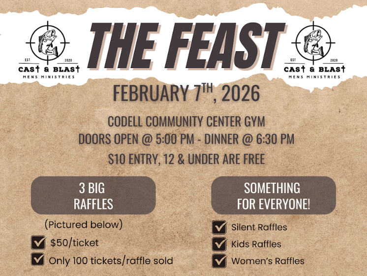 You’re invited to attend The Feast on February 7, 2026! This event is for the whole family & will be full of hunting & fishing related raffle items, silent auction items, and items for kids & ladies too! The cost is $10 at the door, kids 12 and under are free. The meal will be catered this year instead of potluck style.